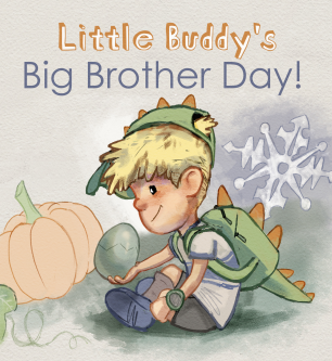 Fiction Picture Book - Buddy must wait until winter to celebrate BIG BROTHER DAY, but his kid-logic can’t speed up the clock. So he plants a toy dinosaur and looks for signs that time is passing—baby kicks, a growing garden, changing seasons—until the snowy day arrives and he finally meets his baby sister… and the dinosaur is dug up for a springtime surprise.